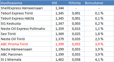 Jotta ABC:lla tankkaaminen tulisi ShellExpress-asemaa halvemmaksi, tulee bonuksien avulla saadun alennuksen bensiinin hinnasta olla vähintään 3,9 %. Hämeenmaan bonustaulukon mukaan 4 % bonukset edellyttävät, että talouden bonusostokset ovat kuukaudessa yli 1000 euroa. Omassa taloudessamme käytämme S-etukorttia noin 400 eurolla kuukaudessa.