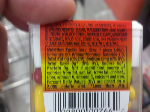 Tämä on kuitenkin vielä pientä. Kaikkein räikein näkemäni tapaus ovat tähän mennessä olleet USA:sta ostamani Tic Tac -karamellit. Kuten oheisesta netistä löytämästäni kuvasta näkyy, tuoteselosteen mukaan Tic Tac -karamelleissa on 0 g sokeria, joka on 0 % suositellusta päiväannoksesta. Oikeasti Tic Tac -karamelleissa on hiilihydraatteja (joista suurin osa sokeria) 97,5 %.