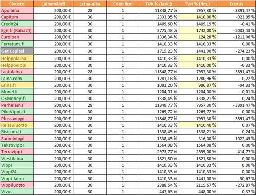 Pikavippien ilmoitetut ja todelliset vuosikorot