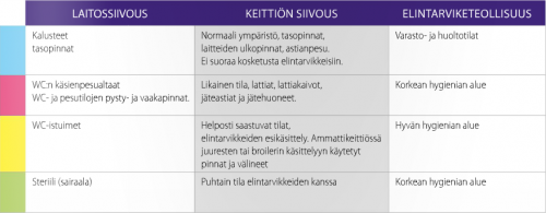 Siivousvälineitä on helpompi käyttää, kun siivouskohteet on jaettu eri alueisiin niiden vaatiman hygieniatason mukaan. Värikoodauksen avulla voidaan estää bakteerien leviäminen siivousvälineen välityksellä eri hygieniatason kohteesta toiseen. Alueiden tunnistamisen apuna käytetään värikoodausta.