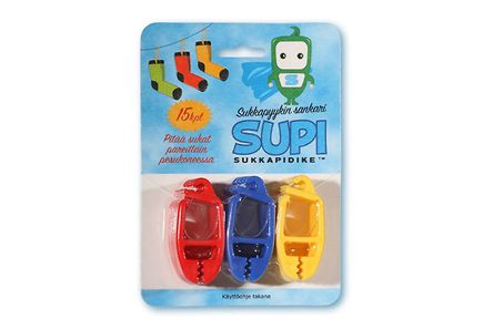 Sukkapidike, jolla niputetaan sukkapari kiinni, ettei pesukone pääse ”syömään” toista. Viidentoista kappaleen pussi Supi sukkapidikkeitä Kärkkäiseltä 4,50 euroa.