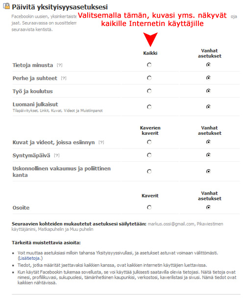 Oheisessa kuvassa näkyy asetussivu, joka tuli näkyviin minulle kirjautuessani tänään Facebookiin. Facebookin suosittelema vaihtoehto ”Kaikki” ei tarkoita kaikkia Facebookin käyttäjiä vaan sananmukaisesti kaikkia Internetin käyttäjiä.
